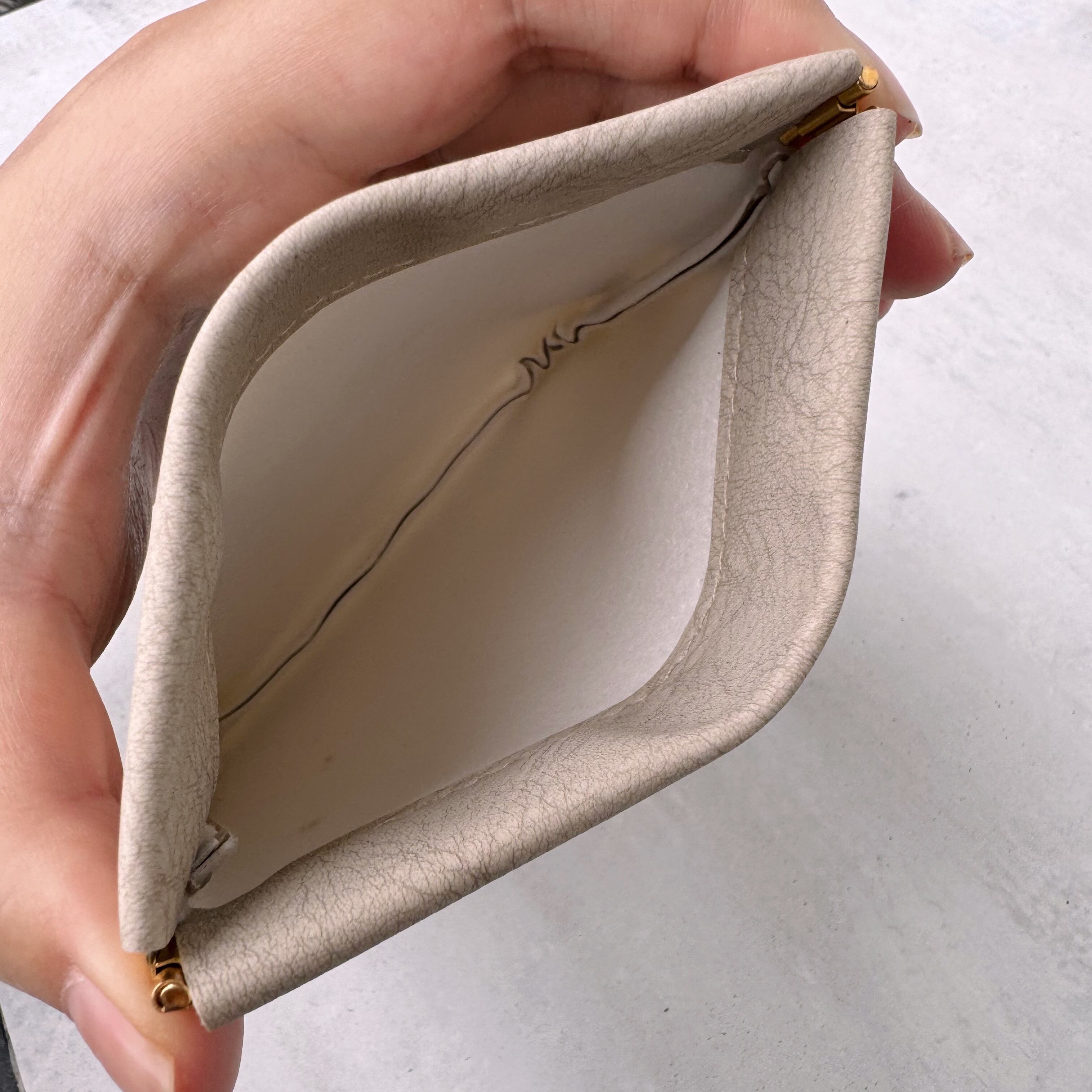 PUレザーのバネ口ポーチです。 高級感があります。 裏面は無地です。 アイボリー・ネイビーの2色からお選びください。 サイズ:W115×H110mm 素材:ポリ塩化ビニル